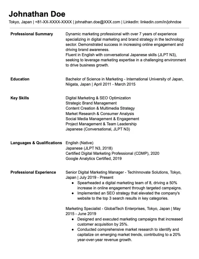 English resumes offer more flexibility for showcasing your JLPT certification compared to the Japanese format. The key is presenting your Japanese proficiency in terms that hiring managers can immediately understand.